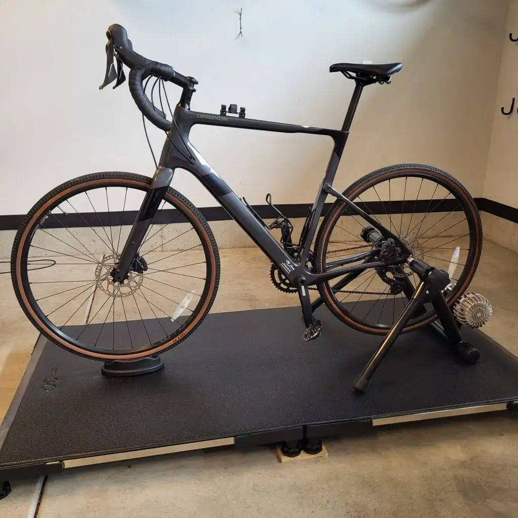 - Bike is attached to a stationary trainer.